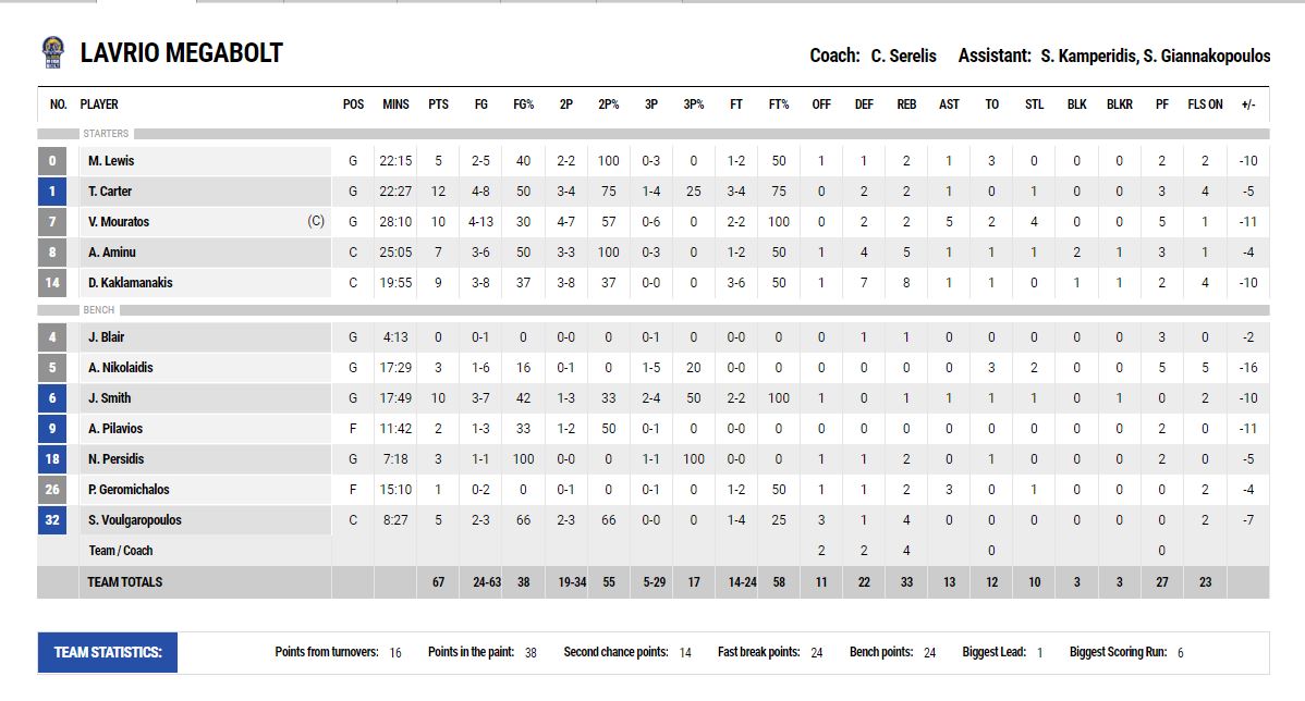 ΛΑΥΡΙΟ (Σερέλης): Λιούις 5, Κάρτερ 12, Μουράτος 10, Αμίνου 7, Κακλαμανάκης 9, Μπλερ, Νικολαϊδης 3, Σμιθ 10, Πιλάβιος 2, Περσίδης 3, Γερομιχαλός 1, Βουλγαρόπουλος 5