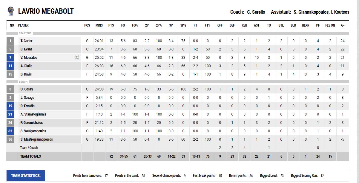 ΛΑΥΡΙΟ (Σερέλης): Κάρτερ 13, Έβανς 7, Μουράτος 11, Ντιαλό 16, Ντέιβις 9, Κόζι 19, Σάβατζ, Ερμείδης, Σταματόγιαννης 2, Γερομιχαλός 2, Βουλγαρόπουλος 2, Μαστρογιαννόπουλος 11