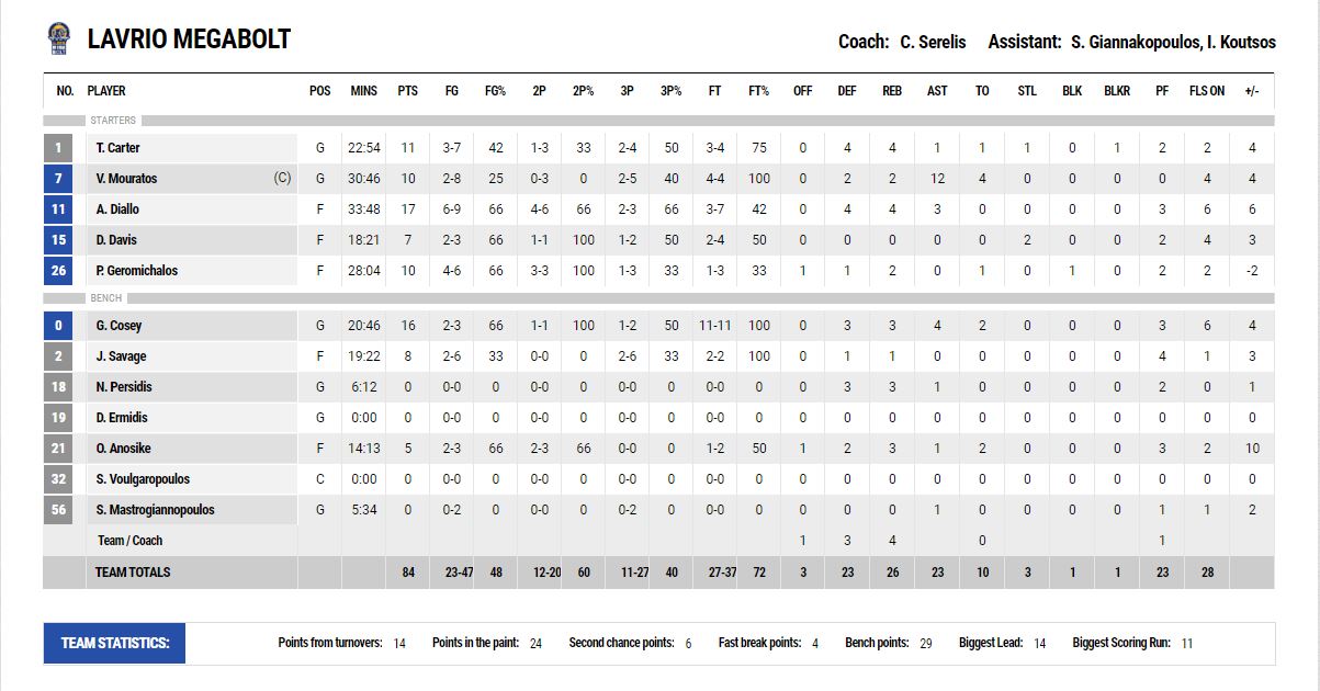 ΛΑΥΡΙΟ (Σερέλης): Κάρτερ 11, Μουράτος 10, Ντιαλό 17, Ντέιβις 7, Γερομιχαλός 10, Κόζι 16, Σάβατζ 8, Περσίδης, Ανοσίκε 5, Μαστρογιαννόπουλος.