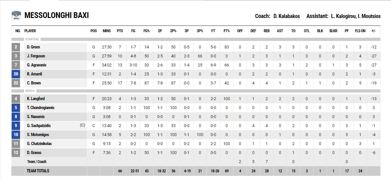ΜΕΣΟΛΟΓΓΙ (Καλαμπάκος): Γκριν 7, Φέργκιουσον 10, Αγραβάνης 13, Αμάρντι 2, Μπράουν 17, Λάνγκφορντ 4, Χονδρογιάννης 2, Ναούμης, Σαχπατζίδης 2, Μοτσενίγος 5, Χατζηνικόλας 2, Γράβας 2
