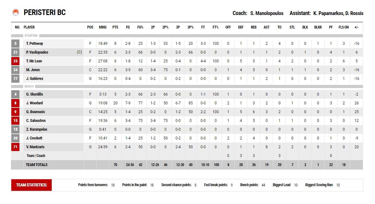 ΠΕΡΙΣΤΕΡΙ (Μανωλόπουλος): Πέτεγουεϊ 8, Βασιλόπουλος 6, ΜακΛιν 6, Τζόουνς 6, Γκουτιέρεζ, Σκορδίλης 5, Γούνταρντ 20, Μπουρούσης 5, Σαλούστρος 6, Καράμπελας, Κρόκετ 2, Μάντζαρης 6