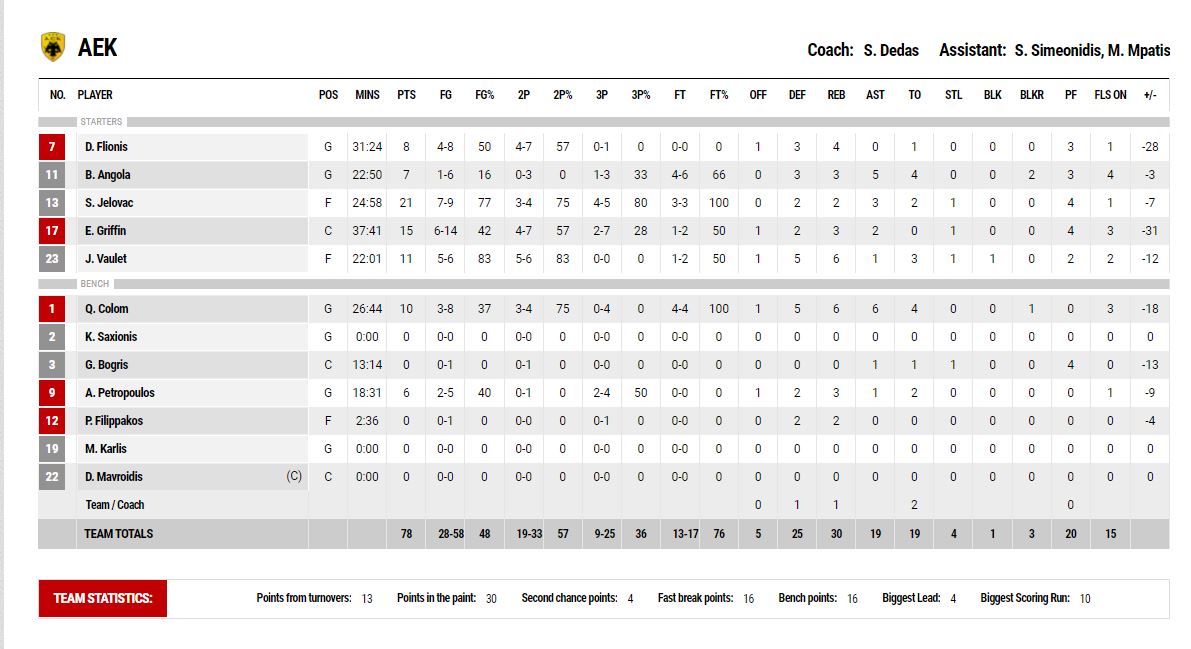 ΑΕΚ (Δέδας): Φλιώνης 8, Ανγκόλα 7, Γέλοβατς 21, Γκρίφιν 15, Βαουλέτ 11, Κολόμ 10, Μπόγρης, Πετρόπουλος 6, Φιλιππάκος