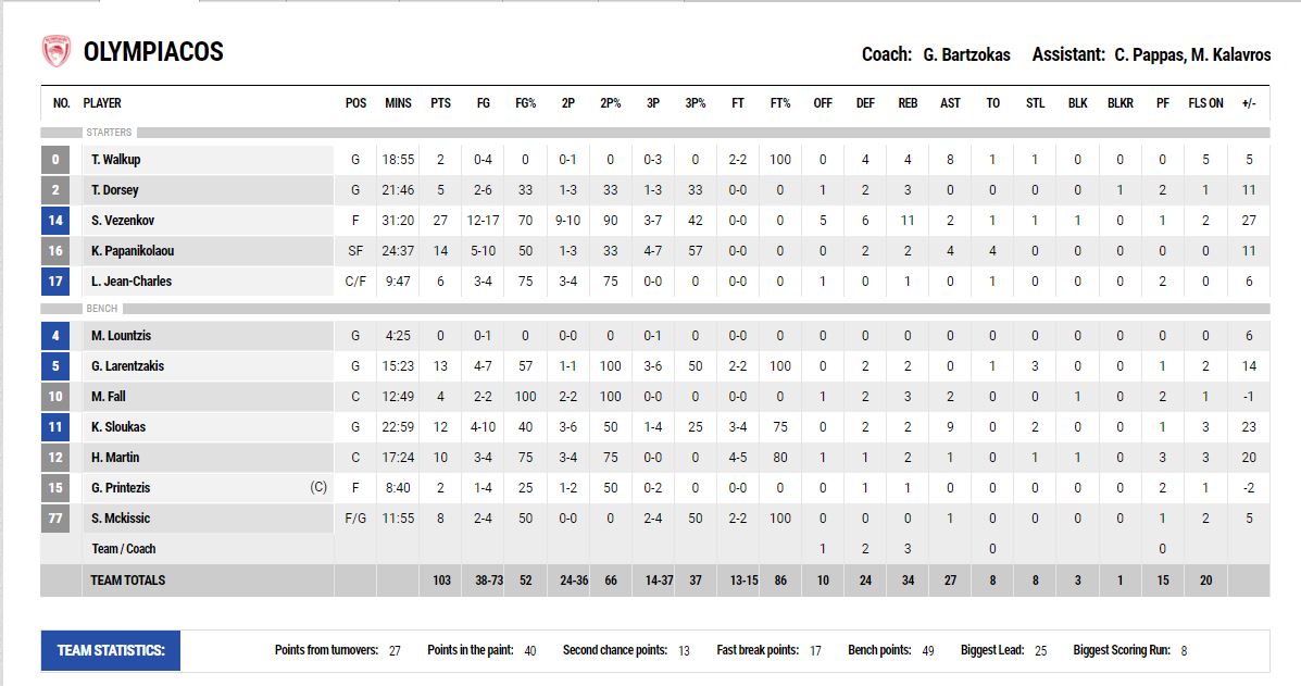 ΟΛΥΜΠΙΑΚΟΣ (Μπαρτζώκας): Γουόκαπ 2, Ντόρσεϊ 5, Βεζένκοφ 27, Παπανικολάου 14, Ζαν Σαρλ 6, Λούντζης, Λαρεντζάκης 13, Φαλ 4, Σλούκας 12, Μάρτιν 10, Πρίντεζης 2, ΜακΚίσικ 8