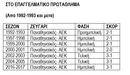 Όπως μπορείτε να δείτε στον πίνακα που ακολουθεί κι αφορά στο επαγγελματικό πρωτάθλημα (από 1992-1993 και μετά) ο Παναθηναϊκός και η ΑΕΚ έχουν συναντηθεί 7 φορές. Σε όλες είχε το πλεονέκτημα έδρας ο Παναθηναϊκός κι επίσης σε όλες πήρε το εισιτήριο της πρόκρισης. Σε διαδικασία πλέι οφ έχουν δώσει συνολικά 23 αγώνες. Ο Παναθηναϊκός έχει 17 νίκες ενώ η ΑΕΚ έχει 6. Η «Ένωση» δεν έχει νικήσει ποτέ στην έδρα του Παναθηναϊκού.