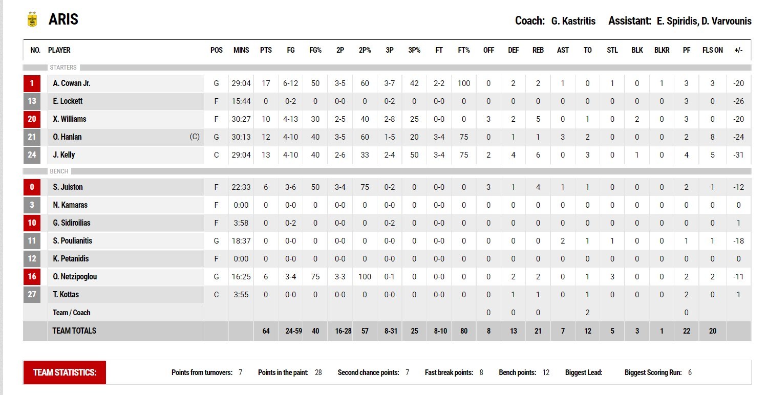 O ΠΑΟΚ προηγήθηκε 29-6 στο τέλος της πρώτης περιόδου ενώ στο 17’30’’ η διαφορά έφτασε στους 30 πόντους (49-19). Χρειάστηκε να περάσουν 19 λεπτά και μετά από 12 άστοχες προσπάθειες να ευστοχήσει σε τρίποντο ο Άρης .