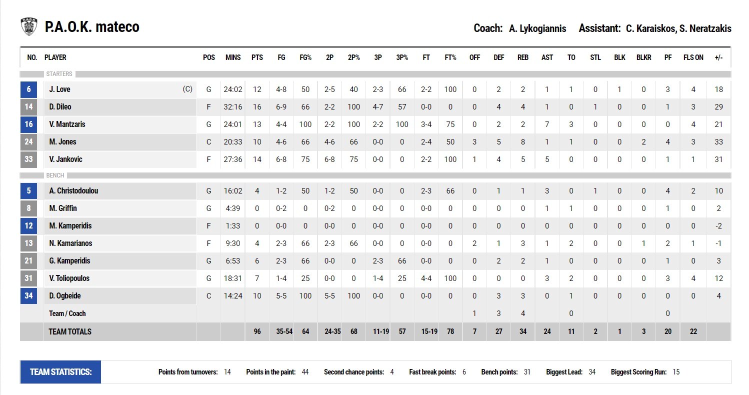 ΠΟΥ ΚΡΙΘΗΚΕ: Δε θέλει βαθιά ανάλυση και φιλοσοφία. Ο τρόπος με τον οποίο μπήκαν οι δύο ομάδες στον αγώνα ήταν ενδεικτικός του τι θα ακολουθούσε. Ο ΠΑΟΚ είχε τρομερή ενέργεια στην άμυνα και ταυτόχρονα είχε εύστοχα και τα 9 πρώτα του σουτ, την ίδια στιγμή που τα… χέρια των αντιπάλων του «έτρεμαν»! Με τη διαφορά στους 15 πόντους από το 4ο λεπτό (!) δε χρειάζεται να συζητήσεις κάτι παραπάνω.