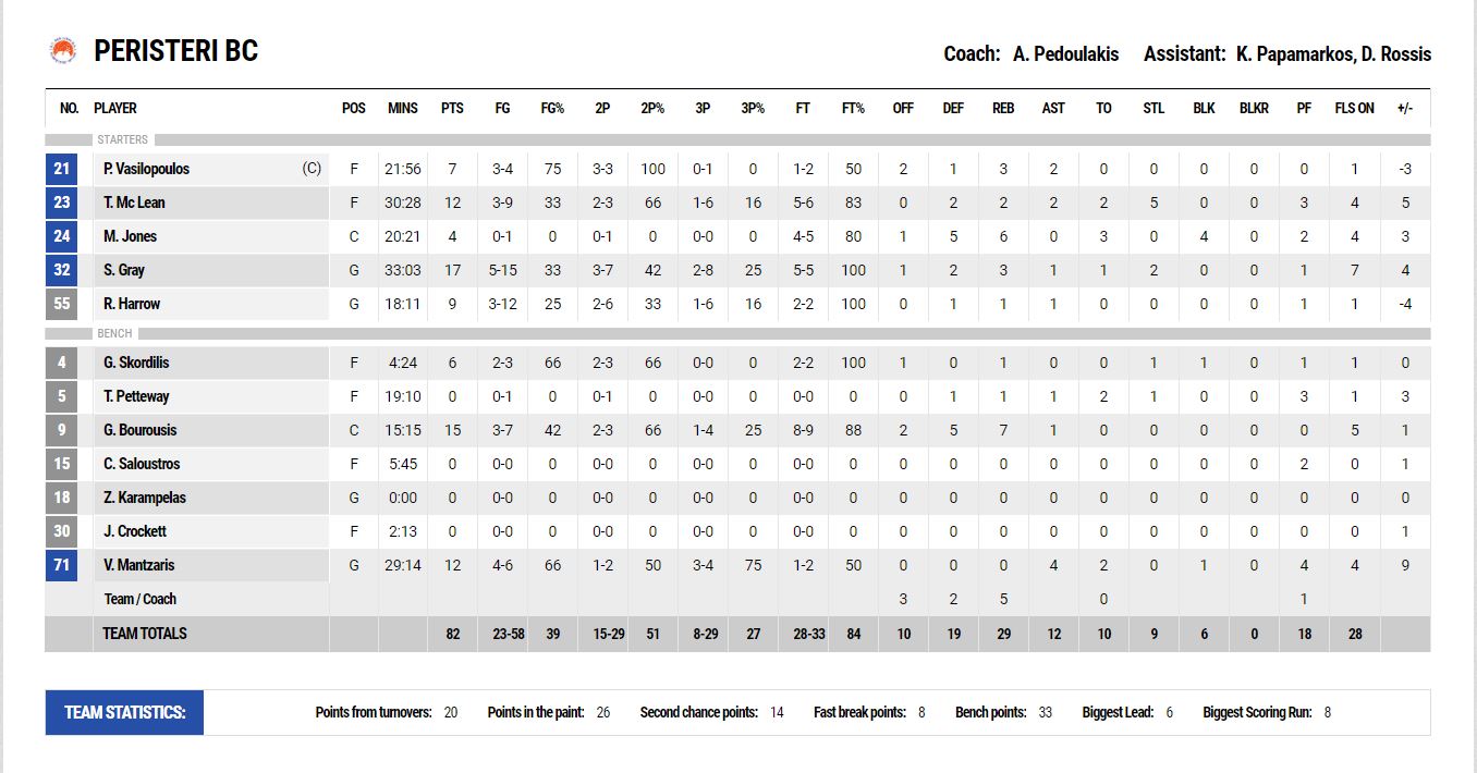 ΠΕΡΙΣΤΕΡΙ (Πεδουλάκης): Βασιλόπουλος 7, ΜακΛέιν 12, Τζόουνς 4, Γκρέι 17, Χάροου 9, Σκορδίλης 6, Πέτεγουεϊ, Μπουρούσης 15, Σαλούστρος, Κρόκετ, Μάντζαρης 12,