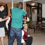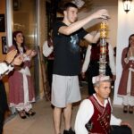 Δείτε το φωτογραφικό υλικό, με τους Τζέιμς Γκιστ και Νίκο Ρογκαβόπουλο να επιχειρούν να ισορροπήσουν στο κεφάλι ενός ανθρώπου πολλά ποτήρια.