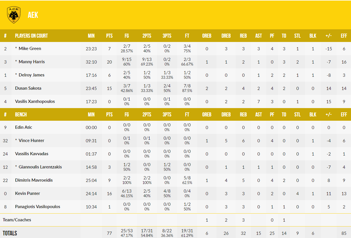 ΑΕΚ (Ντρ.Σάκοτα): Γκριν 7, Χάρις 20 (9/13 διπ., 0/2 τριπ., 2/3 βολές), Τζέιμς 6 (1), Σάκοτα 15 (1/3 διπ., 2/4 τριπ., 7/8 βοβλές), Ξανθόπουλος (7 ασίστ), Χάντερ, Καββαδάς, Λαρεντζάκης 3 (1), Μαυροειδής 9, Πάντερ 16 (2/5 διπ., 4/8 τριπ., 0/4 βολές), Βασιλόπουλος 1.