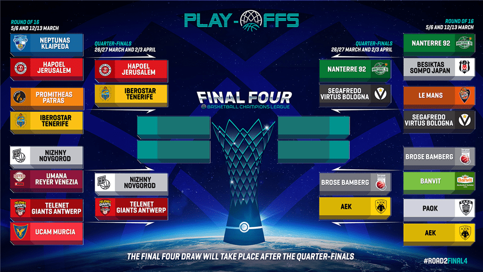 Οι δύο ομάδες είχαν συναντηθεί και στη φάση των ομίλων, με την Ένωση να νικάστο ΟΑΚΑ με 97-86 και την Μπάμπεργκ στην έδρα της με 77-73. Ο. Το πρώτο παιχνίδι θα διεξαχθεί στη Γερμανία στις 26-27 Μαρτίου, ενώ η ρεβάνς της Αθήνας στις 2-3 Απριλίου.