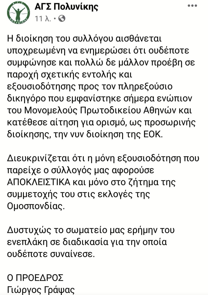 Όμως ακολούθησε ένα ακόμα θέμα. Ο «Πολυνίκης» ένας από τους συλλόγους που εμφανίζονται να ζητούν αίτηση για ορισμό, ως προσωρινής διοίκησης τη νυν διοίκηση της ΕΟΚ, δηλώνει ότι ερήμην του ενεπλάκη σε μια διαδικασία για την οποία ουδέποτε συναίνεσε.