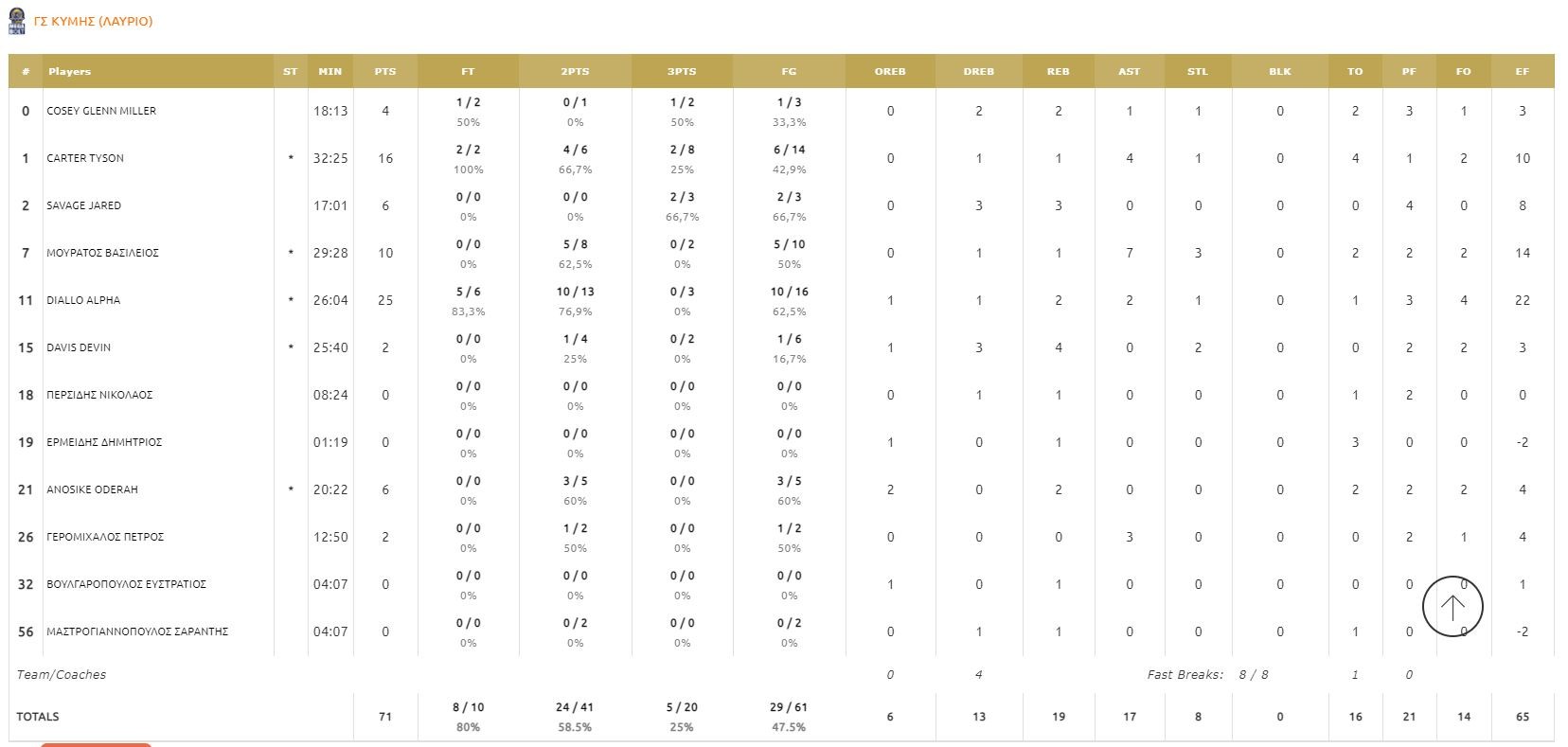 ΛΑΥΡΙΟ (Σερέλης): Κόζι 4, Κάρτερ 16, Σάβατζ 6, Μουράτος 10, Ντιαλό 25, Ντέιβις 2, Περσίδης, Ερμείδης, Ανοσίκε 6, Γερομιχαλός 2, Βουλγαρόπουλος, Μαστρογιαννόπουλος