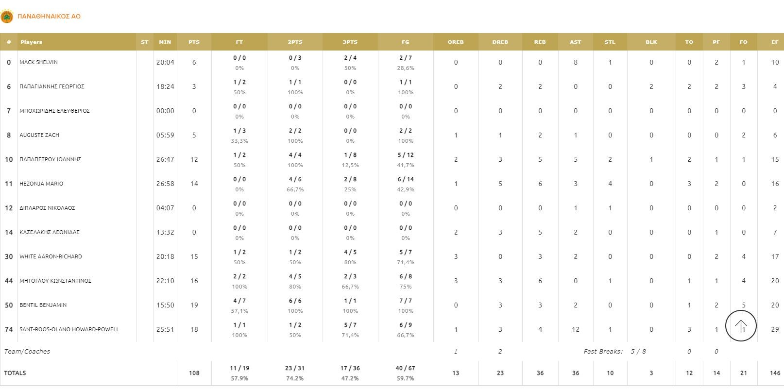 ΠΑΝΑΘΗΝΑΪΚΟΣ (Κάτας): Μακ 6, Παπαγιάννης 3, Όγκαστ 5, Παπαπέτρου 12, Χεζόνια 14, Δίπλαρος, Κασελάκης, Γουάιτ 15, Μήτογλου 16, Μπέντιλ 19, Σαντ Ρος 18