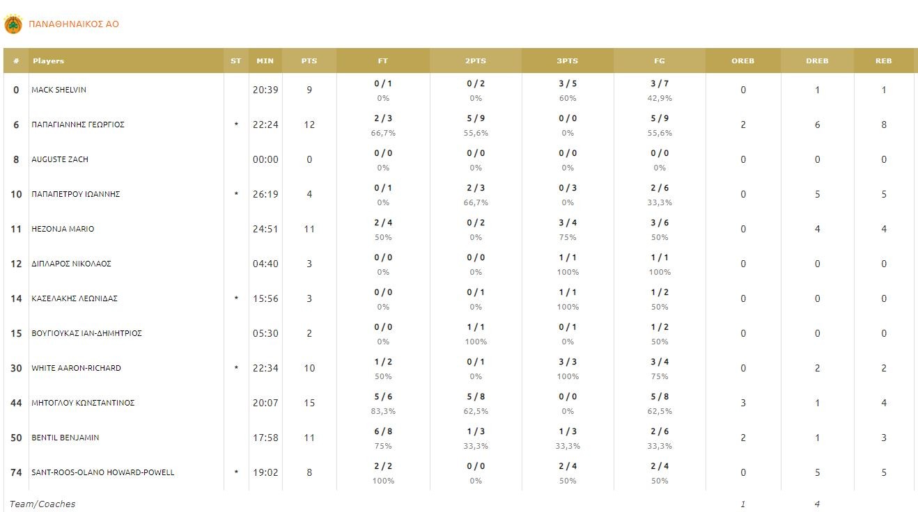 ΠΑΝΑΘΗΝΑΪΚΟΣ (Κάτας): Μακ 9, Παπαγιάννης 12, Παπαπέτρου 4, Χεζόνια 11, Δίπλαρος 3, Κασελάκης 3, Βουγιούκας 2, Γουάιτ 10, Μήτογλου 15, Μπέντιλ 11, Σαντ-Ρος 8