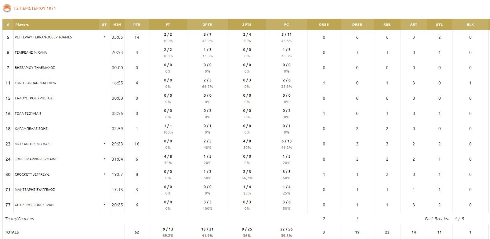 ΠΕΡΙΣΤΕΡΙ (Μανωλόπουλος): Πέτεγουεϊ 14, Τσαϊρέλης 4, Φορντ 4, Τόλα, Καράμπελας 1, ΜακΛιν 16, Τζόουνς 6, Κρόκετ 8, Μάντζαρης 3, Γκουτιέρεζ 6