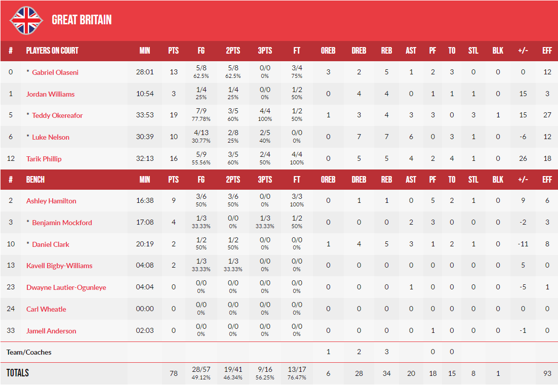 ΜΕΓΑΛΗ ΒΡΕΤΑΝΙΑ (Στέουτελ): Ολασένι 13, Γουίλιαμς 3, Οκερέαφορ 19, Νέλσον 10, Φίλιπ 16, Χάμιλτον 9, Μόκφορντ 4, Κλαρκ 2, Μπίγκντι Γουίλιαμς 2, Ογκουνλέιγιε