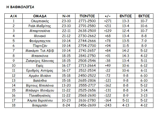 Σε τετραπλή ισοβαθμία Φενέρ- Μακάμπι- Παρτιζάν και Μπασκόνια η σειρά είναι: 5.Μπασκόνια, 6.Μακάμπι, 7.Παρτιζάν και 8.Φενέρμπαχτσε