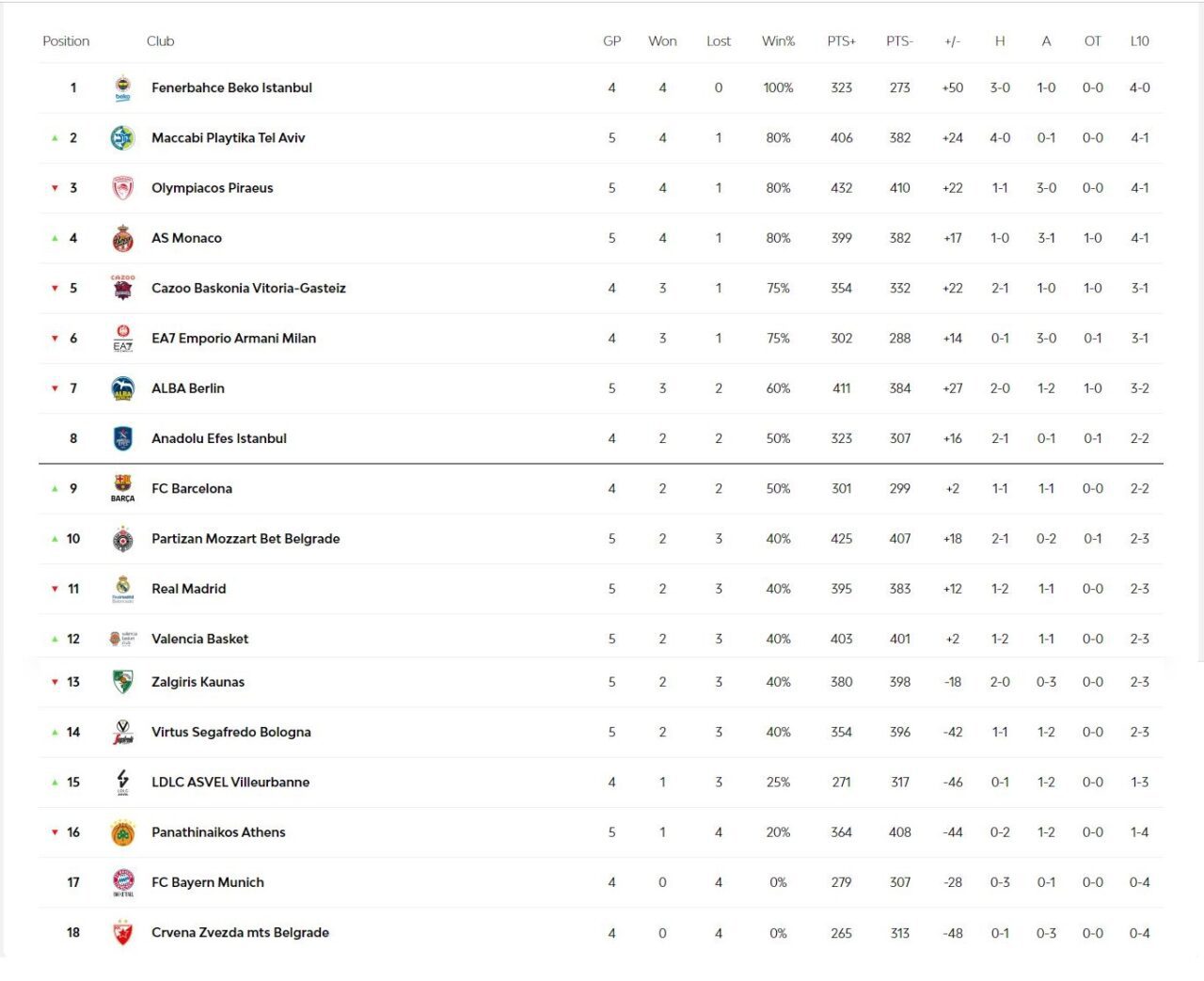 Κι έτσι την «έπιασε» στη βαθμολογία της Euroleague όπου μετά την ήττα του Ολυμπιακού από την Μονακό μοναδική αήττητη ομάδα είναι η Φενέρμπαχτσε που την Παρασκευή (28/10) έχει το μεγάλο ντέρμπι με την Εφές.