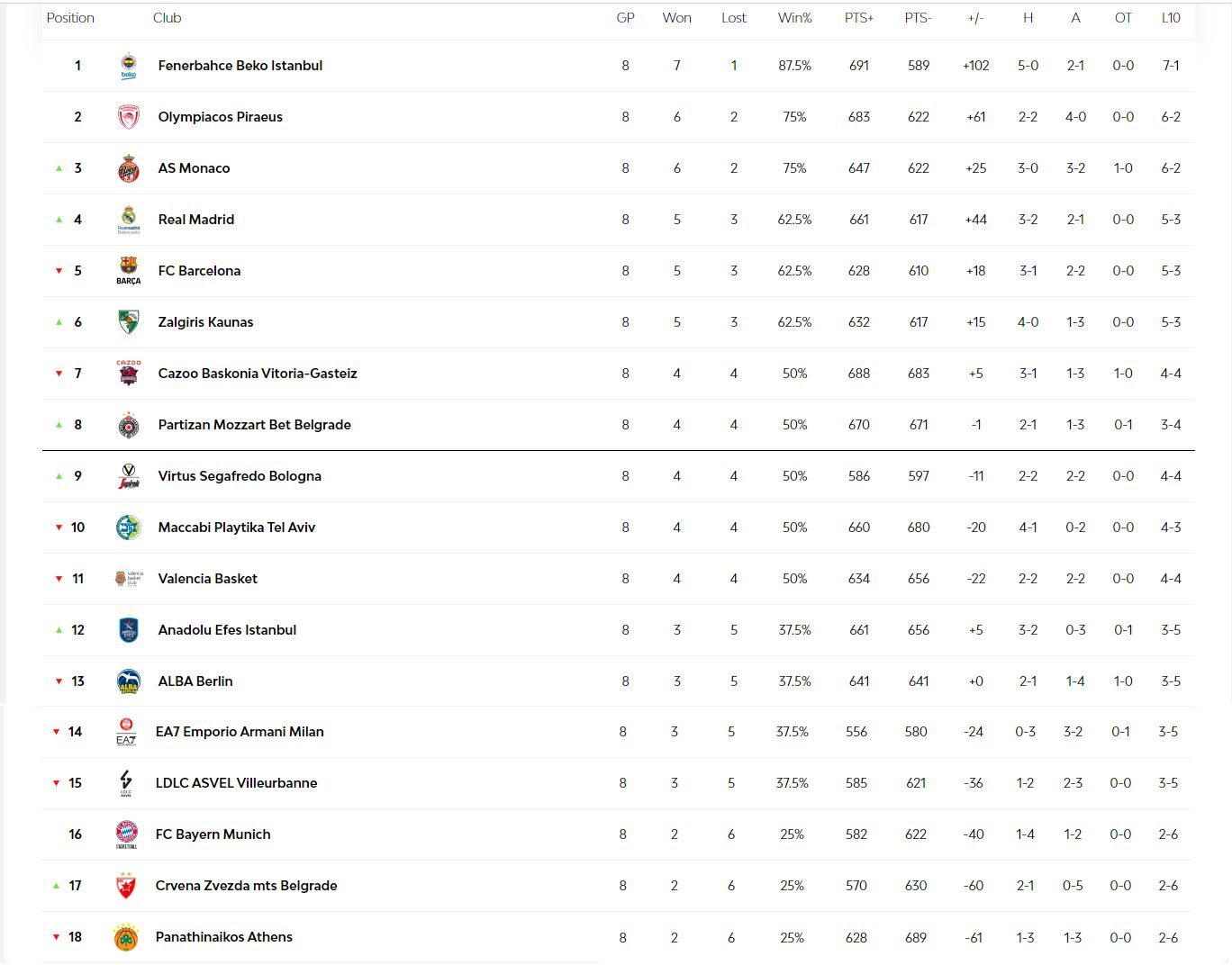 Το οποίο με -61 είναι το χειρότερο στην Euroleague μόλις ένα πόντο χαμηλότερα από τον Ερυθρό Αστέρα που έχει -60. Ο Ολυμπιακός από την πλευρά του παραμένει δεύτερος και ισόβαθμος με την Μονακό η οποία είχε δύσκολη αποστολή αλλά τα κατάφερε κόντρα στην Μπασκόνια.