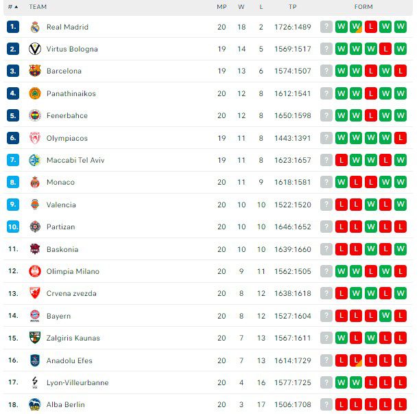 Η βαθμολογία της EuroLeague μετά τα σημερινά αποτελέσματα και τη νίκη του Παναθηναϊκού.