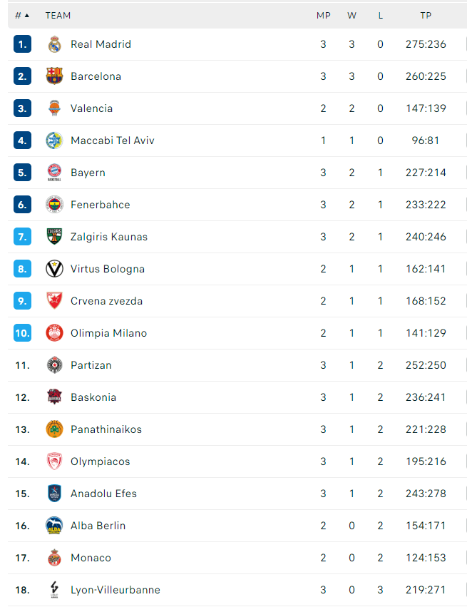 Euroleague: Η βαθμολογία (σε 3 αγωνιστικές)