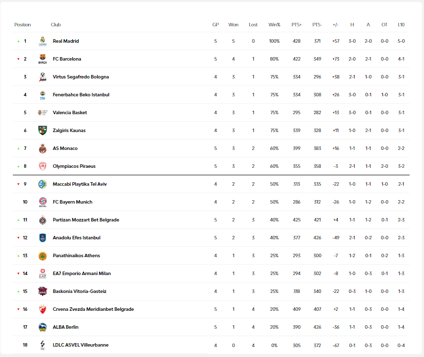 Euroleague: Η βαθμολογία σε 5 αγωνιστικές