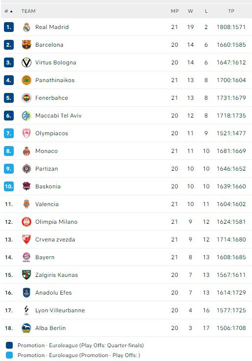 Οσον αφορά το τριφύλλι βελτίωσε το ρεκόρ του στο 13-8 (όπως ακριβώς και η Φενέρμπαχτσε του Σάρας) και παραμένει σταθερά στην 4άδα της κορυφής. Από την πλευρά του ο Ολυμπιακός έχει απολογισμό 11 νίκες και 9 ήττες ενώ την Παρασκευή (12/1, 21:30) θα αντιμετωπίσει τη Μπασκόνια επί ισπανικού εδάφους.