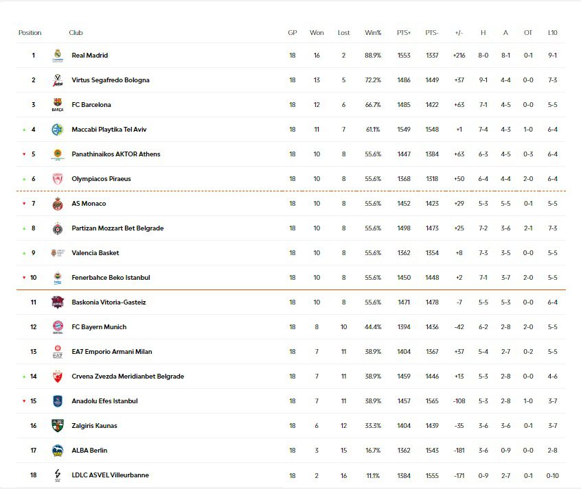 Η βαθμολογία στη Euroleague σε 18 αγωνιστικές