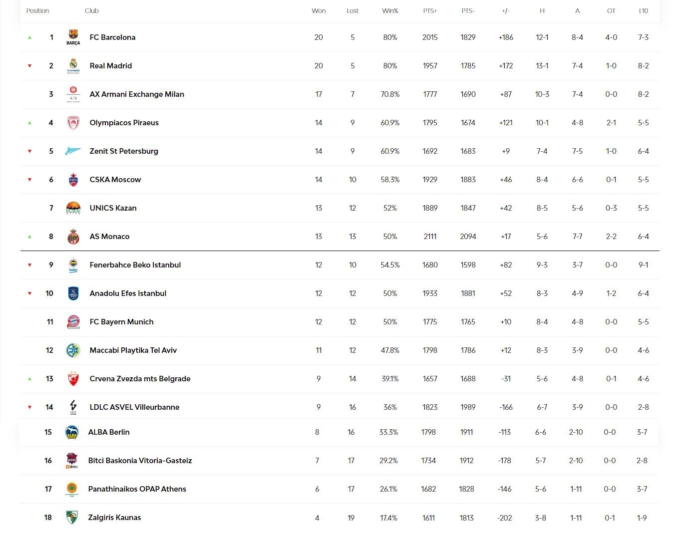 Η νίκη της Μονακό επί της Ούνικς Καζάν (την Τρίτη 22/2) έφερε σημαντικές ανακατατάξεις στη βαθμολογία αφού οι Γάλλοι προωθήθηκαν στην πρώτη οχτάδα της βαθμολογίας.