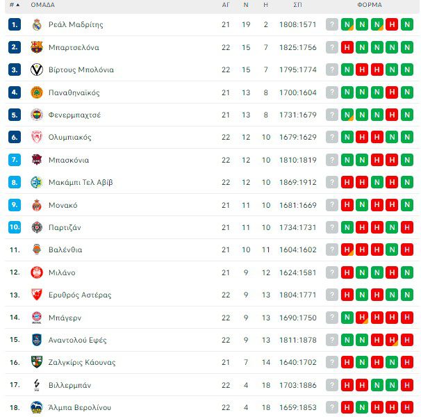 EuroLeague βαθμολογία: Αναλυτικά η κατάταξη