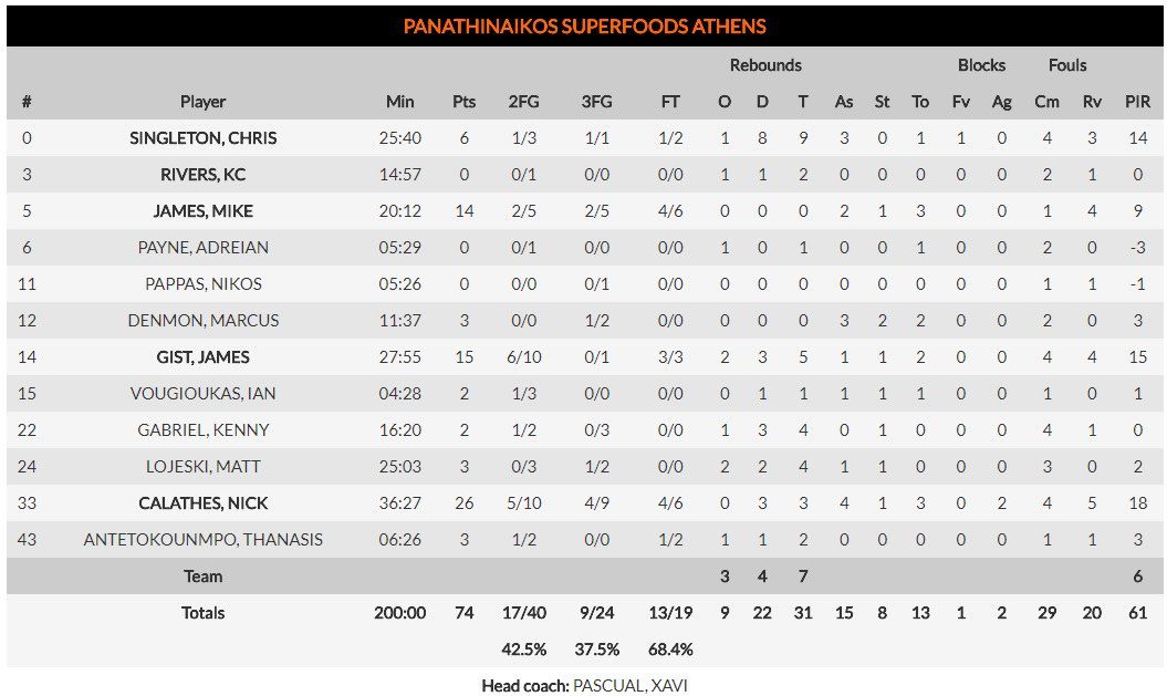 ΠΑΝΑΘΗΝΑΙΚΟΣ (Τ. Πασκουάλ): Σίγκλετον 6, Ρίβερς, Τζέιμς 14 (2), Πέιν, Παππάς, Ντένμον 3 (1), Γκιστ 15, Βουγιούκας 2, Γκάμπριελ 2, Λοτζέσκι 3 (1), Καλάθης 26 (4), Αντετοκούνμπο 3.
