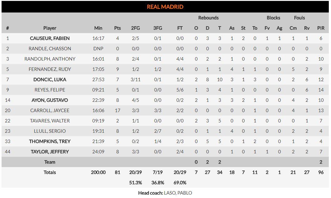 ΡΕΑΛ ΜΑΔΡΙΤΗΣ (Π. Λάσο): Κοσέρ 4, Ράντολφ 8, Φερνάντες 9 (1), Ντόνσιτς 7 (10ριμπ.), Ρέγιες 5, Αγιόν 8, Κάρολ 17 (3), Ταβάρες 2, Γιουλ 8, Τόμπκινς 5 (1), Τέιλορ 8.