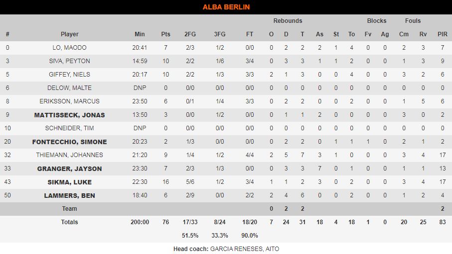 ΑΛΜΠΑ ΒΕΡΟΛΙΝΟΥ (Ρενέσες): Λο 7, Σίβα 10, Γκιφάι 10, Έρικσον 6, Μάτισεκ 3, Φοντέκιο 2, Τίμαν 9, Γκρέιντζερ 7, Σίκμα 16, Λάμερς 6.