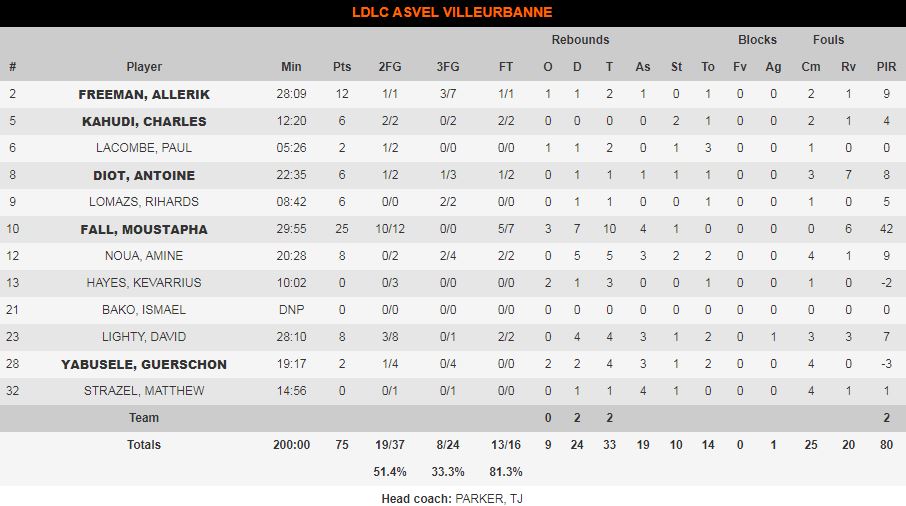 ΒΙΛΕΡΜΠΑΝ (Πάρκερ): Φρίμαν 12, Καουντί 6, Λακόμπ 2, Ντιό 6, Λόμαζ 6, Φαλ 25, Νουά 8, Λάιτι 8, Γιαμπουσελέ 2, Στραζέλ.