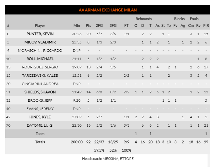 ΑΡΜΑΝΙ ΜΙΛΑΝΟ (Μεσίνα): Πάντερ 20, Μίτσοφ 8, Ρολ 5, Ροντρίγκεζ 13, Ταρσζέφσκι 7, Σιλντς 14, Μπρουκς 5, Χάινς 5, Ντατόμε 16