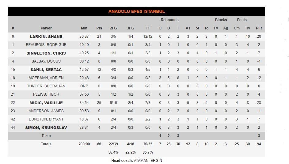ΕΦΕΣ (Αταμάν): Λάρκιν 21, Μπομπουά 3, Σίνγκλετον 4, Μπαλμπάι, Σανλί 12, Μορμάν 6, Πλάις 5, Μίσιτς 25, Αντερσον, Ντάνστον 6, Σίμον 4