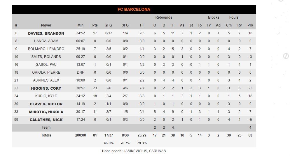 ΜΠΑΡΤΣΕΛΟΝΑ (Γιασικεβίτσιους): Ντέιβις 17, Μπομπάρο 7, Σμιτς, Γκασόλ 1, Αμπρίνες 2, Χίγκινς 23, Κούριτς 18, Κλαβέρ 2, Μίροτιτς 11, Καλάθης