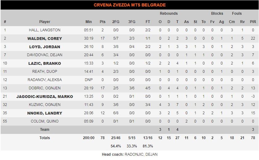 ΕΡΥΘΡΟΣ ΑΣΤΕΡΑΣ (Ράντονιτς): Χολ 2, Γουόλντεν 17, Λόιντ 8, Νταβίντοβατς 6 , Λάζιτς 3, Ριθ 4, Ντόμπριτς 17, Γιάγκοντιτς-Κουρίτζα, Κούζμιτς 9, Νόκο 12 (6/8 δίποντα, 5 ριμπάουντ), Κολόμ