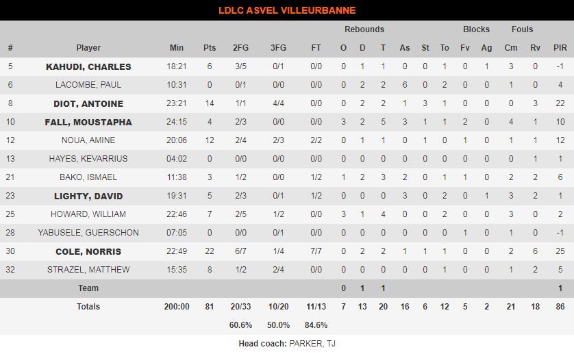 ΒΙΛΕΡΜΠΑΝ (Πάρκερ): Καχούντι 6, Λακόμπ, Ντιό 14, Φαλ 4, Νουά 12, Χέιζ, Μπάκο 3, Λάιτι 4, Χάουαρντ 7, Γιαμπουσέλε, Κόουλ 22, Στράζελ 8