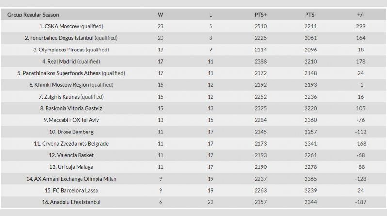 Ο Ολυμπιακός με τη νίκη επί της Εφές «κλείδωσε» το πλεονέκτημα έδρας, όμως στις δύο αγωνιστικές που απομένουν μπορεί να τερματίσει από δεύτερος μέχρι τέταρτος με την τρίτη θέση να μοιάζει πιο σίγουρη. Αναφορικά με την έτερη ελληνική ομάδα, ο Παναθηναϊκός θα πρέπει να περιμένει δώρο από την Ρεάλ για να πάρει το πλεονέκτημα έδρας, ενώ φαίνεται να «καπαρώνει» την πέμπτη θέση.