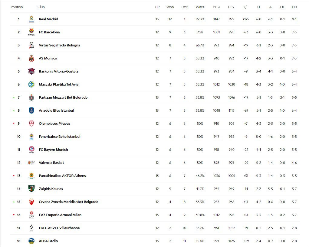 Αυτή είναι η βαθμολογία στη Euroleague μετά τη την ήττα του Παναθηναϊκού από τη Ρεάλ Μαδρίτης για την 13η αγωνιστική.