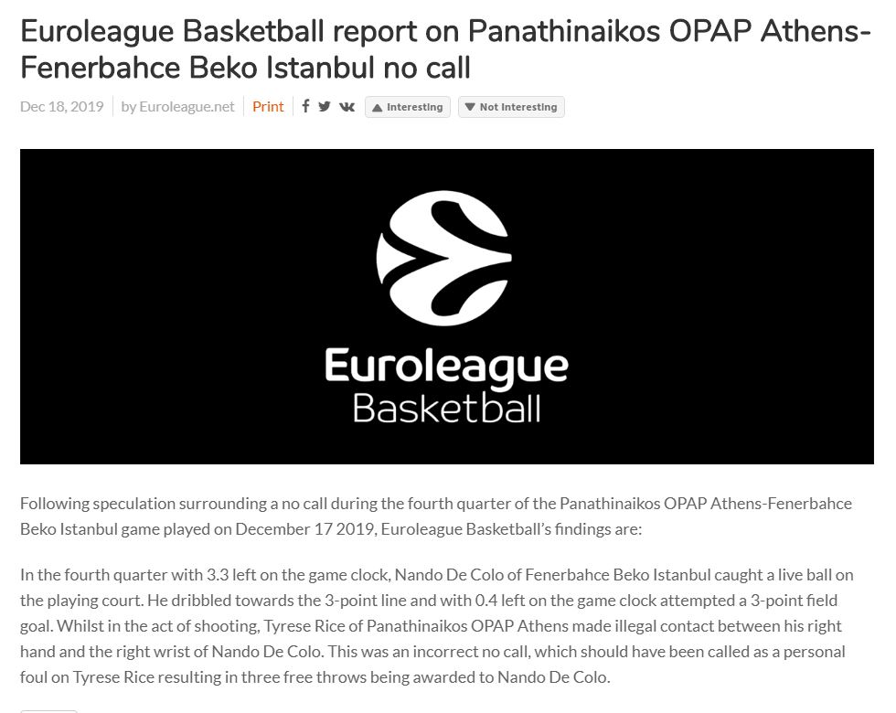 «Σε συνέχεια της φημολογίας για το no call φάουλ στην τελευταία περίοδο του αγώνα Παναθηναϊκός ΟΠΑΠ-Φενέρμπαχτσε στις 17 Δεκεμβρίου 2019, η έρευνα της EuroLeague αναφέρει: