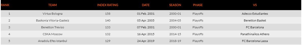 Από την πρώτη διοργάνωση (2000-2001) κρατάει η καλύτερη επίδοση στην αξιολόγηση σε αγώνα PlayOffs. Με 158 βαθμούς το έχει η Βίρτους Μπολόνια στον αγώνα με την Εστουδιάντες.
