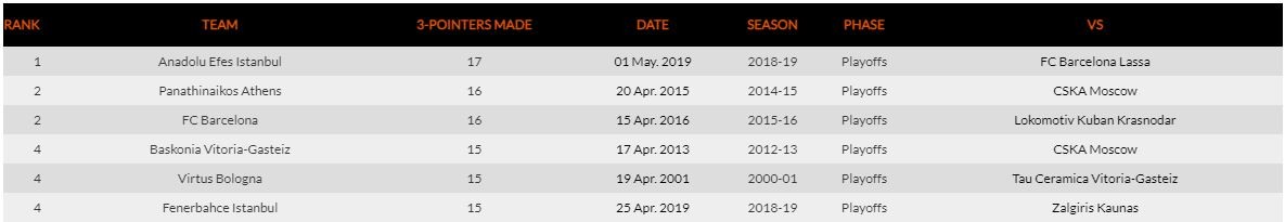 Συνολικά έξι ομάδες στην ιστορία των PlayOffs της Euroleague έχουν πετύχει πάνω από 15 τρίποντα σ’ έναν αγώνα. Στη δεύτερη θέση, όπως βλέπετε, ισοβαθμούν ο Παναθηναϊκός και η Μπαρτσελόνα που έχουν από 16 εύστοχα τρίποντα.