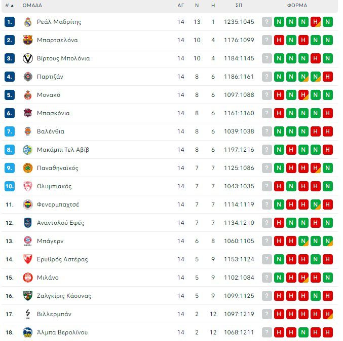 Η Βαθμολογία της Euroleague (σε 14 αγωνιστικές)
