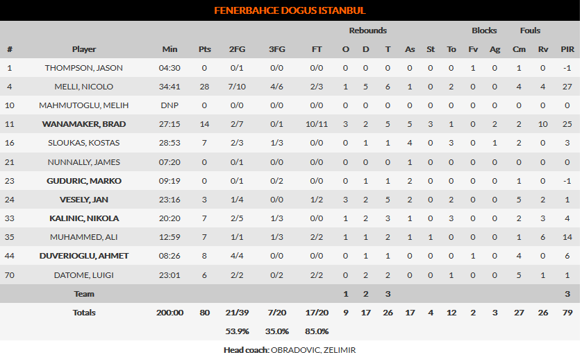 ΦΕΝΕΡΜΠΑΧΤΣΕ (Ζ.Ομπράντοβιτς): Τόμπσον, Μέλι 28 (4), Γουαναμέικερ 14 (10/11 βολές), Σλούκας 7 (1), Νάναλι, Γκούντουριτς, Βέσελι 3, Κάλινιτς 7 (1), Ντίξον 7 (1), Ντουβερίογλου 8, Ντατόμε 6.