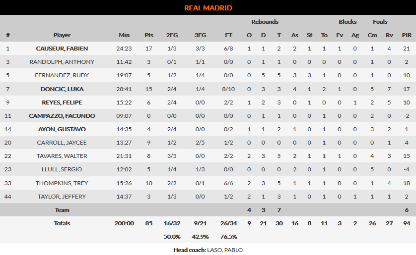 ΡΕΑΛ ΜΑΔΡΙΤΗΣ (Π.Λάσο): Κοζέρ 17 (3), Ράντολφ 3 (1), Φερνάντεθ 5 (1), Ντόντσιτς 15 (1), Ρέγιες 6, Καμπάτσο, Αγιόν 4, Κάρολ 9 (2), Ταβάρες 8, Γιούλ 5 (1), Τόμπκινς 10, Τέιλορ 3.
