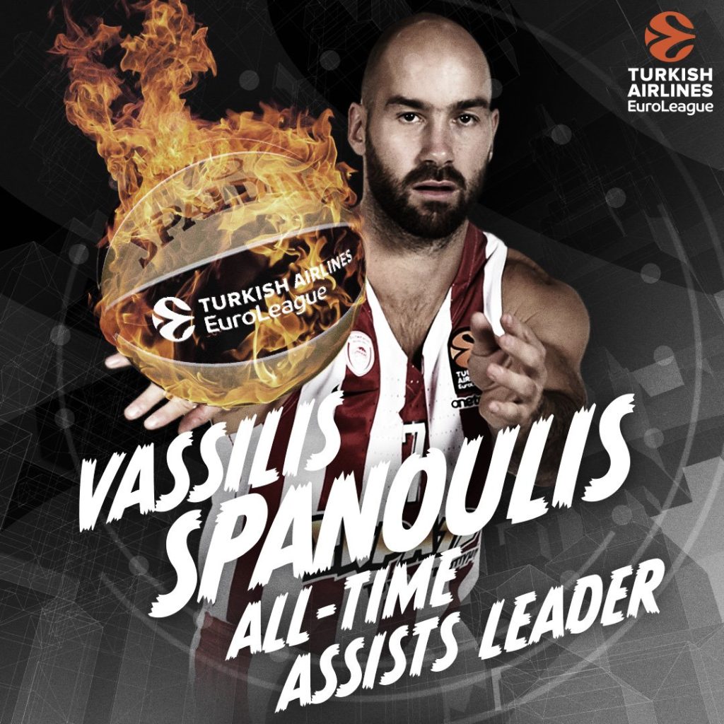 Πλέον, τα ιστορικά κιτάπια της Ευρωλίγκας θα αναγράφουν πως ο Βασίλης Σπανούλης (ένας από τους 4 παίκτες μαζί με τους Μίλος Τεόντοσιτς και Τομά Ερτέλ με τετραψήφιο αριθμό ασίστ) ξεπέρασε τον Δημήτρη Διαμαντίδη. Ο αρχηγός του Ολυμπιακού μετράει, πια, 1.256 ασίστ και ο άλλοτε αρχηγός του Παναθηναϊκού έχει μείνει στις 1.255.