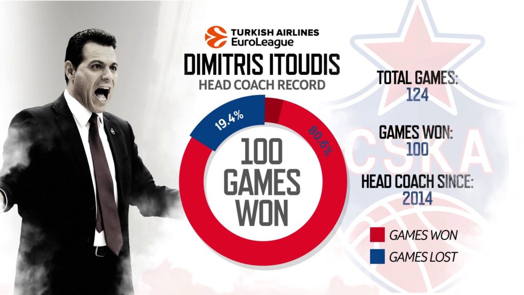 Ο Δημήτρης Ιτούδης τα κατάφερε! Μπήκε σε ένα ιδιαίτερο κλαμπ, πετυχαίνοντας την 100ή νίκη του στην Ευρωλίγκα. Για να το πετύχει χρειάστηκε 124 αγώνες (ποσοστό 80.6%) και όλα αυτά σε διάστημα 4 ετών!