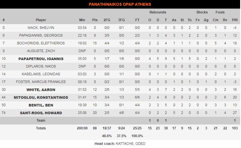 Τρομερή εμφάνιση από Μποχωρίδη- Σαντ Ρος, εξαιρετικοί Μήτογλου- Παπαγιάννης- Γουάιτ και Μπεντίλ από έναν Παναθηναϊκό που ήξερε τι ζητούσε. Μόνο ο ΜακΚίσικ ξεχώρισε από τον Ολυμπιακό